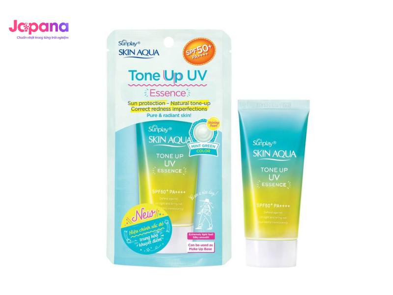 Da mụn có nên dùng kem chống nắng Skin Aqua? Skin Aqua Tone Up UV Essence Mint Green SPF50+ PA++++ là dòng kem chống nắng hoàn hảo dành cho da mụn với chỉ số SPF 50+ và PA++++ giúp chống nắng tối ưu đến 8 tiếng.